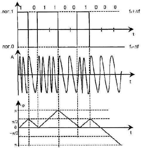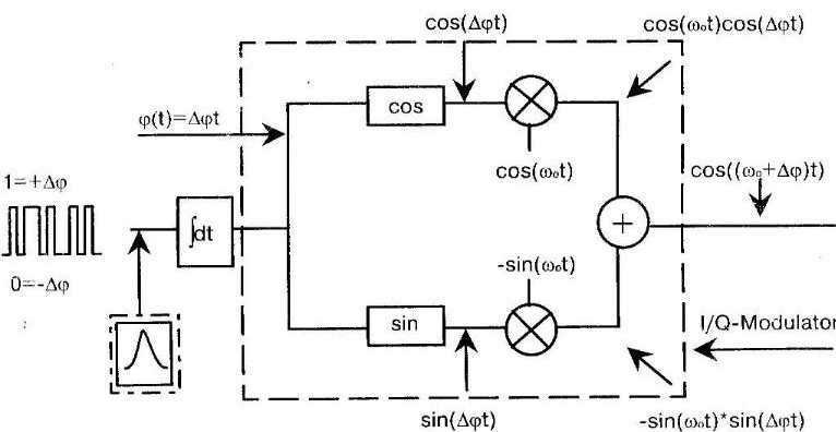 В стандарте GSM применяется спектрально-эффективная гауссовская частотная манипуляция п минимальным частотным сдвигом (GMSK). Манипуляция называется "гауссовской" потому, что последовательность информационных бит до модулятора проходит через фильтр нижних частот (ФНЧ) с характеристикой Гаусса, что дает значительное уменьшение полосы частот излучаемого радиосигнала [2.2, 2.3]. формирование GMSK радиосигнала осуществляется таким образом, что на интервале одного информационного бита фаза несущей изменяется на 90°. Это наименьшее возможное изменение фазы, распознаваемое при данном типе модуляции. Непрерывное измене ние фазы синусоидального сигнала дает в результате частотную модуляцию с дискпстн^м и^меч^ нием частоты. Применение фильтра Гаусса позволяет при дискрегном изменении частоты получить "гладкие переходы". В стандарте GSM применяется GMSK-модуляция с величиной нормированной полосы ВТ = 0,3, где В - ширина полосы фильтра по уровню минус 3 дБ, Т - длительность одного бита цифрового сообщения. Принципиальная схема модулятора показана на рис. 2.5.