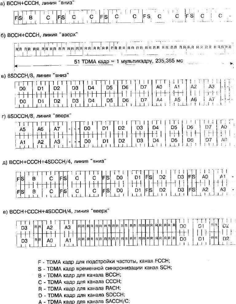 Существуют и другие переменные структуры, которые могут использоваться в 51-кадровом мультикадре. "Переменными" их называют потому, что их структура изменяется в зависимости от нагрузки в соте. В одном случае может рассматриваться индивидуальный канал управления 8SDCCH/8 в одном физическом канале (рис. 2.4 в, г). Однако, если нагрузка в соте мала, структу-y BCCH/CCCH можно объединить с индиаидуальным каналом управления SDCCH/4 (рис. 2.4 д, е) в одном физическом канале. Если сота испытывает большую нагрузку, одного физического канала может быть недостаточно для всего трафика BCCH/CCCH. В этом случае временные интервалы 2, 4 и 6 б структуре ВССН также используют для этой цели, однако в этом случае передаются пустые интервалы вместо SCH и FCCH.