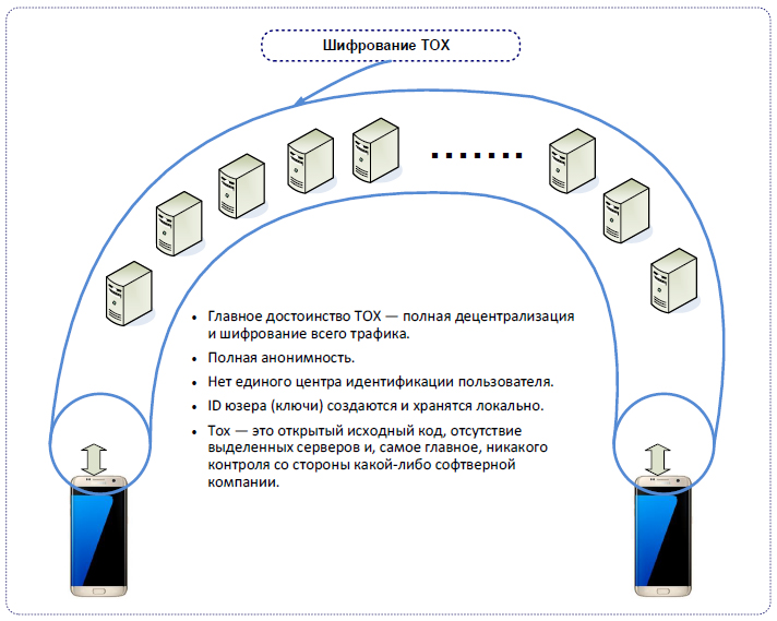 Для соединения двух приложений Tox используется механизм луковой маршрутизации («onion routing»).