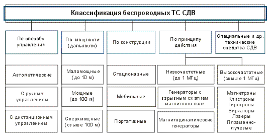Анализ показывает, что наиболее опасными ТС СДВ для интегрированных систем безопасности являются технические средства силового деструктивного воздействия по эфиру с использованием электромагнитного импульса (беспроводные ТС СДВ). Особенно это относится к мощным мобильным ТС СДВ, деструктивное действие которых может осуществляться с неохраняемой территории. К сожалению, недостаток открытой информации по данному виду ТС СДВ существенно осложняет их классификацию. Классификация беспроводных ТС СДВ, использованная в данной работе, приведена на рис. 6.