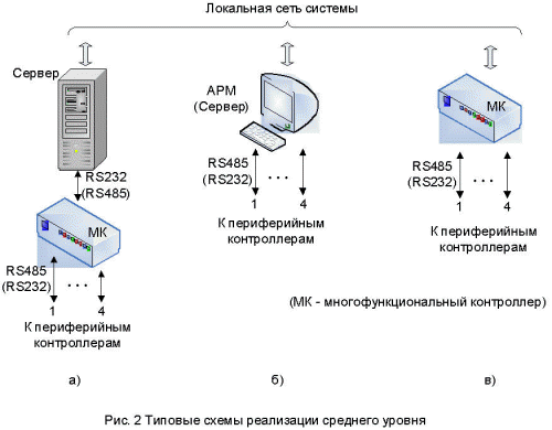 Стоит отметить, что существует схема, когда АРМ взаимодействует с многофункциональным контроллером, который, в свою очередь, управляет периферийными контроллерами. Эта схема является разновидностью решения рис. 2а и подробно рассмотрена выше.